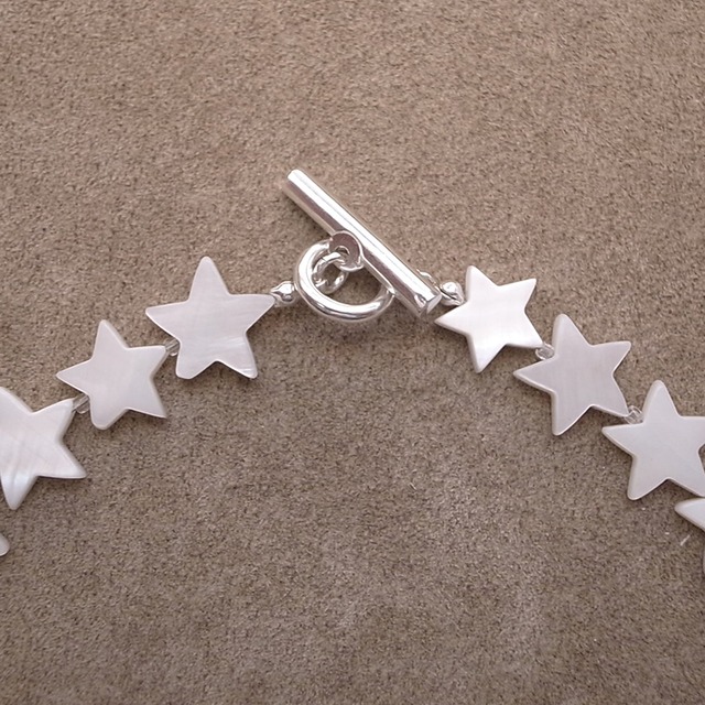PEARL SHELL TOGGLE NECKLACE- STAR パールシェル トグル ネックレス- スター SIZE: 全長 約41cm ビーズ幅:約12mm 素材:貝殻(Mather of pearl) トグルパーツ:真鍮(シルバーメッッキ) 真珠母貝:Mather of pearl を使ったネックレスになります。 Ivory(象牙)カラーの中に独特の光沢が特徴で、世界中で長く愛されるパーツです。 CIRCLE, STAR, SQUARE, HEARTのバリエーションがあります。
