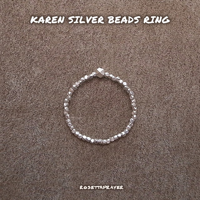 KAREN SILVER BEADS RING カレンシルバービーズ リング カレンシルバーとはミャンマーやタイ北部に住む少人数の山間民族によって、手作りで作製されている高純度のシルバー。 そのカレンシルバーのキューブカットビーズを使ったシルバービーズリングになります。 素材:95~99%の高純度シルバー ビーズ幅: 約1.2~1.5mm SIZE: 7号(約47mm), 9号(約49mm), 11号(約51mm), 13号(約53mm), 15号(約55.5mm), 17号(約57.5mm)19号(約59.5mm), 21号(約62mm), 23号(約64mm), 25号(66mm)