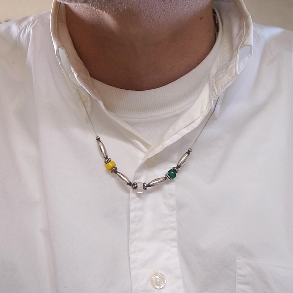 ナバホパールとビンテージホワイトハーツビーズのコンビネーションネックレスになります。