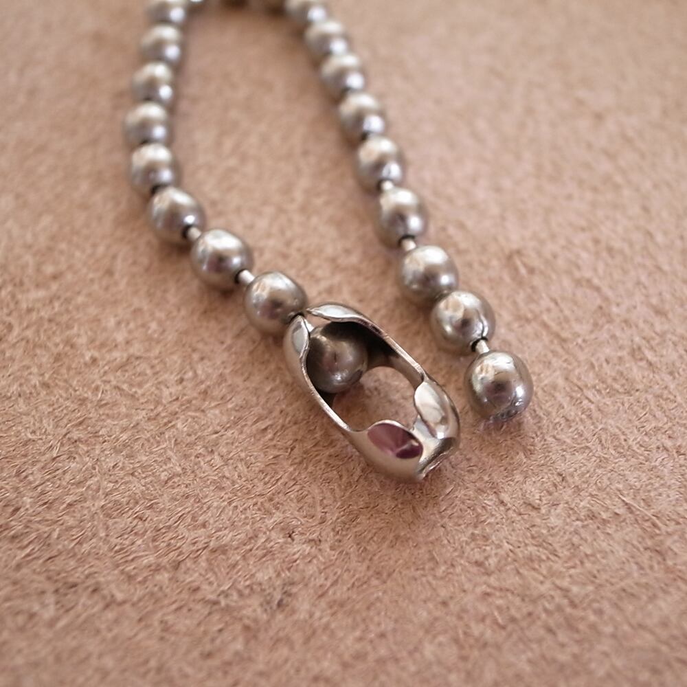 Import item Made in U.S.A. There is 4 size of 6mm width ball chain.The connector has a hole and can stop at own size position.