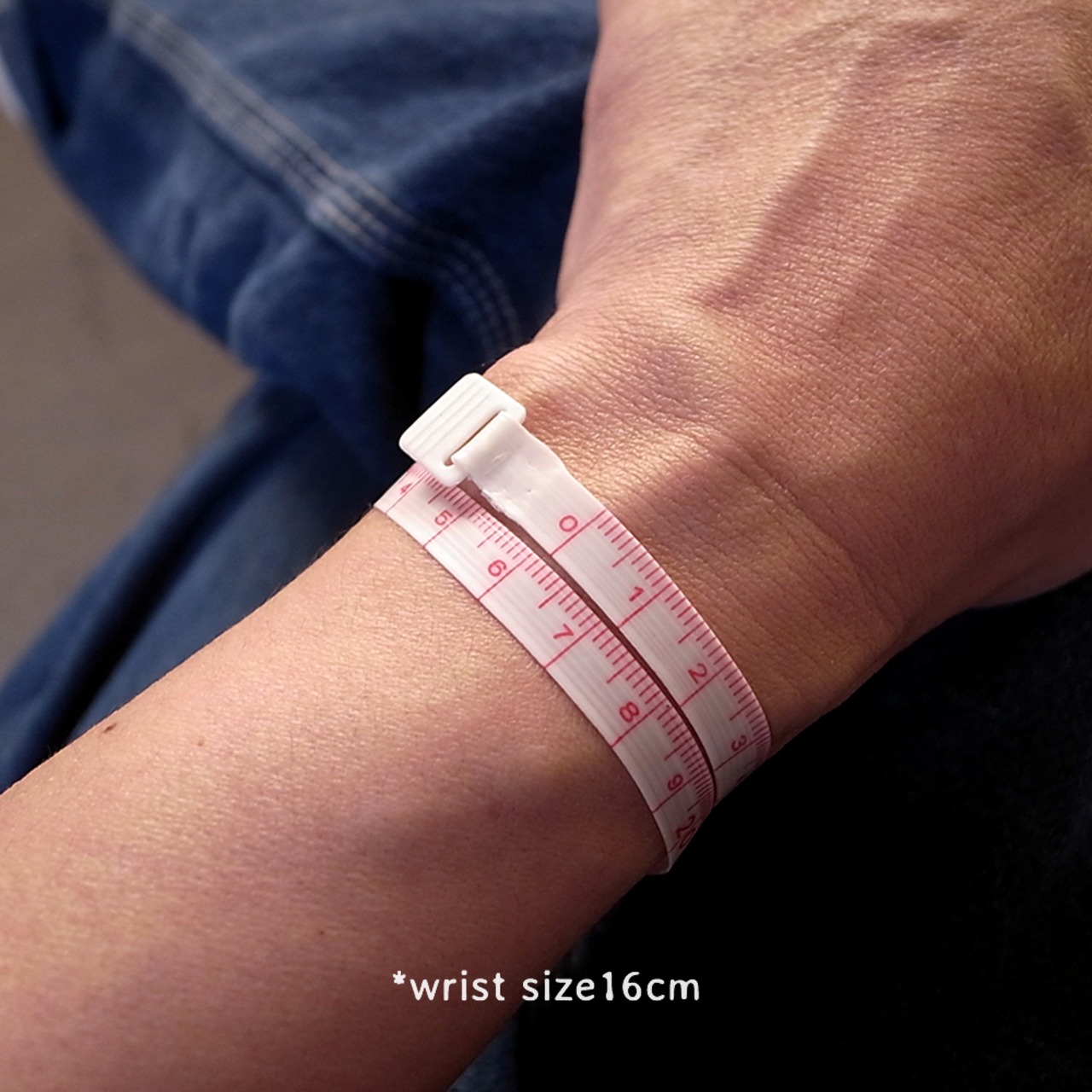 手首回りのサイズにプラス1~1.5cmぐらいのサイズが目安です。